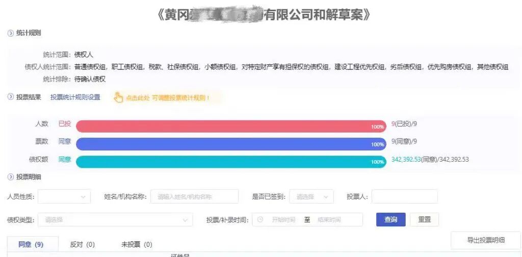“经本次债权人会议表决,黄冈某教育咨询公司破产和解协议(草案)获得全票通过!”5月14日,黄州区人民法院召开首例小微民营企业破产和解案件债权人会议。案件从破产立案到《和解协议草案》全票表决通过仅用时44天,9笔债权全额受偿,债权清偿率为100%。在有效保障债权人合法权益的同时,也为优化区域营商环境,助力困境企业纾困重生提供了生动范例。