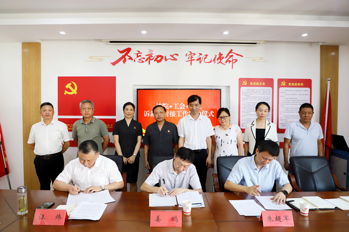 黄州区人民法院党组书记、院长姜鹏,黄州区总工会党组书记、常务副主席朱超军和黄州区人力资源和社会保障局党组书记、局长汪炜共同签订了《法院+工会+人社劳动争议诉裁调对接工作机制协议》。